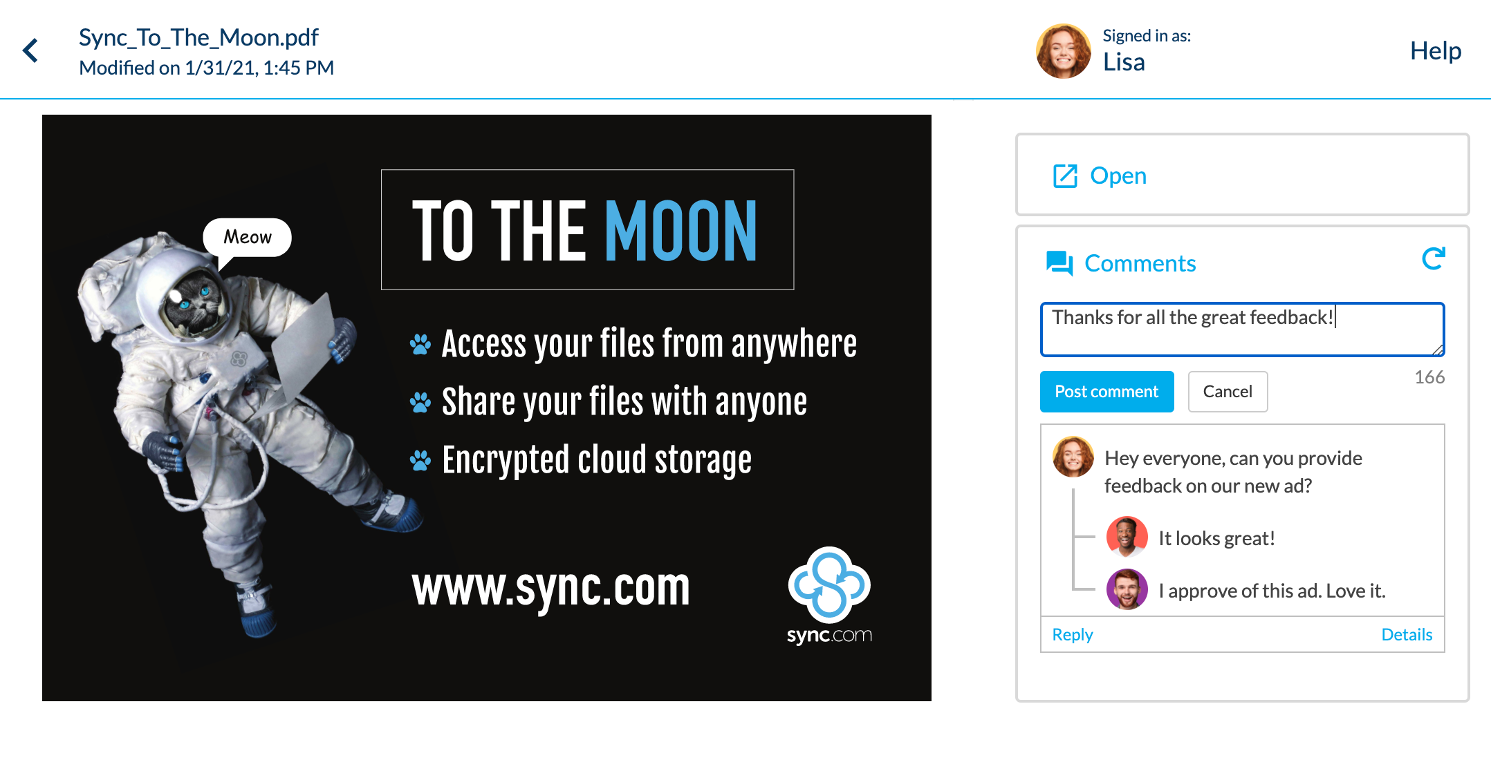 Now you can collect feedback on your work quickly and easily, as the people you share files with don’t have to switch platforms to respond. All comments stay there with the file and are readily available to you from Sync. It’s a spectacular time-saver.